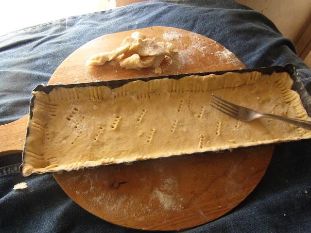 Roll and cut pastry to fit 11 cm x 35 cm rectangular tin(or other tin) ease it into the tin overlapping any pastry joins. Trim edges and place tin on an oven tray.